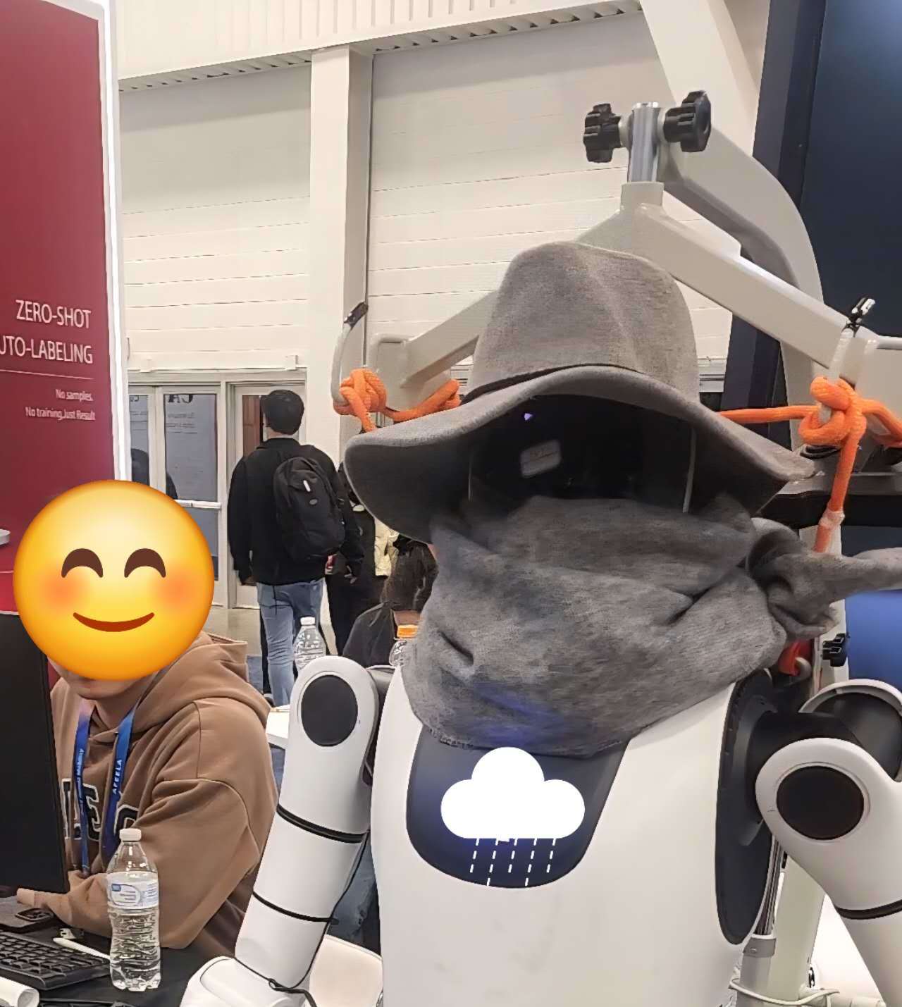 展會(huì)第二日,有展商指著頭戴帽子、系著圍巾,正在完成分揀工作的機(jī)器人問記者是否有注意到不同,得到否定回答后笑著解釋,前日收展時(shí)不小心把該機(jī)器人摔壞了“頭”,但公司技術(shù)和研發(fā)團(tuán)隊(duì)被拒簽,只剩一群“門外漢”干著急,只好連夜給機(jī)器人做了“搶修手術(shù)”,才有了這一“西部牛仔”的創(chuàng)意造型。