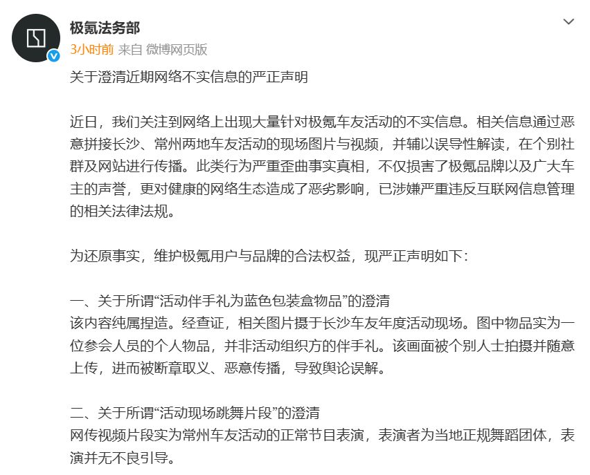 1月14日極氪法務(wù)部發(fā)聲明,澄清網(wǎng)絡(luò)關(guān)于極氪車(chē)友活動(dòng)的不實(shí)信息。惡意拼接的長(zhǎng)沙、常州車(chē)友活動(dòng)圖片視頻被誤導(dǎo)性解讀,損害品牌和車(chē)主聲譽(yù)。聲明指出,伴手禮、跳舞片段及兩地活動(dòng)關(guān)聯(lián)性均為捏造,已固定侵權(quán)證據(jù)并將追究法律責(zé)任,同時(shí)呼吁網(wǎng)友尊重事實(shí),共同維護(hù)清朗網(wǎng)絡(luò)環(huán)境。
