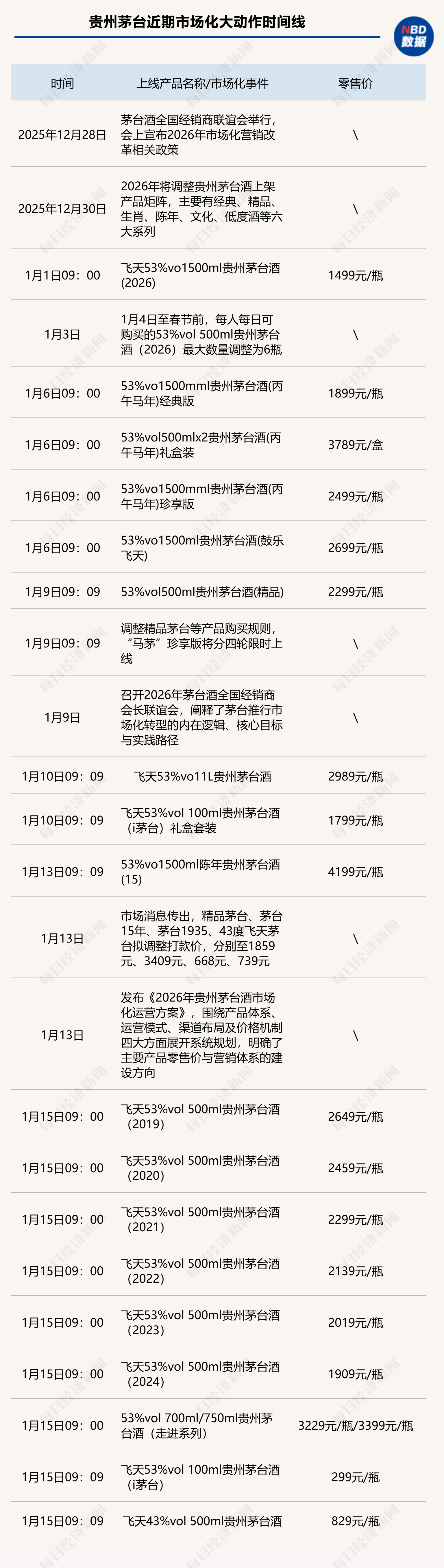 《每日經(jīng)濟新聞·將進酒》記者梳理了“i茅臺”上新日歷,1月1日~1月15日,短短15天時間就有近20款茅臺酒上線。不僅如此,其上線搶購的價格也出人意料。2026年飛天茅臺直接以1499元/瓶銷售,就連新一輪馬年生肖茅臺酒,經(jīng)典版也來到了1899元/瓶,低于去年蛇年生肖茅臺酒的價格。