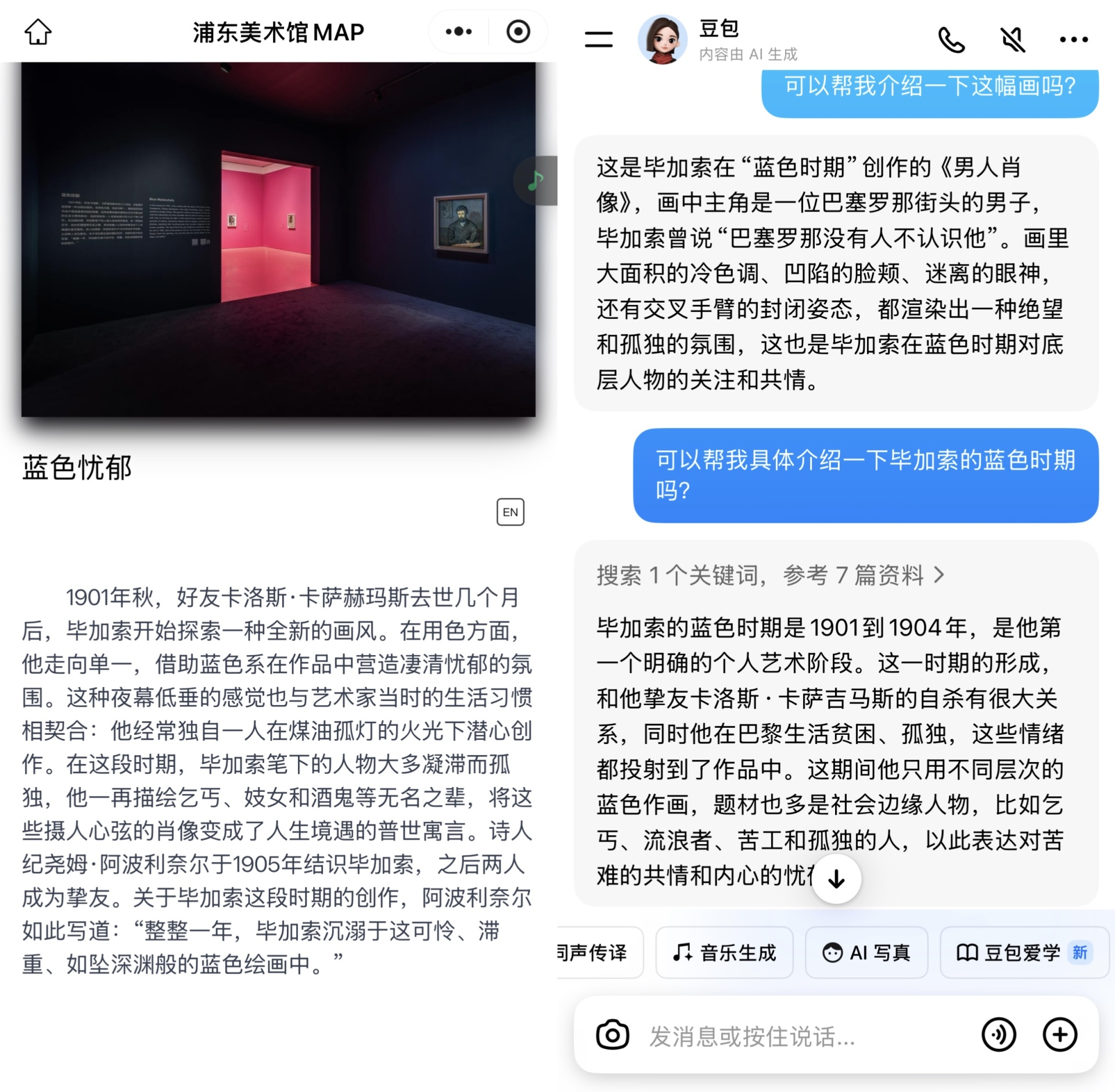 1月20日,字節(jié)跳動旗下豆包與上海浦東美術館達成合作,正式成為該館兩項國際大展——“圖案的奇跡:盧浮宮印度、伊朗與奧斯曼的藝術杰作”與“非常畢加索:保羅·史密斯的新視角”的官方AI講解員。這也是AI產品首次以“官方身份”進駐美術館。