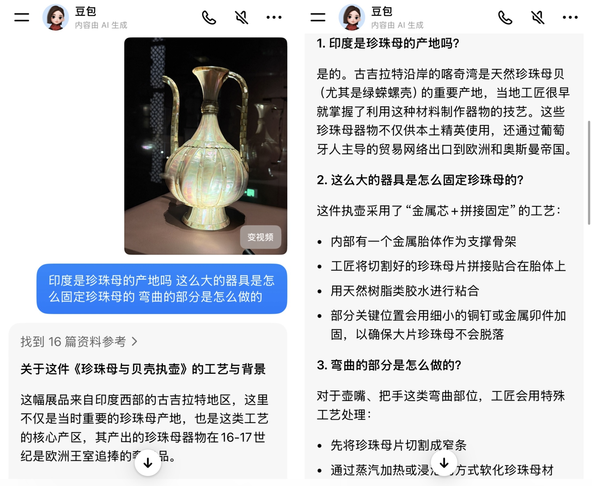 為此,豆包與浦東美術館進行了獨家數據合作與定向搜索優(yōu)化,以此提升了文物識別與講解的可靠性,并實現了支持連續(xù)、深入追問的交互體驗。