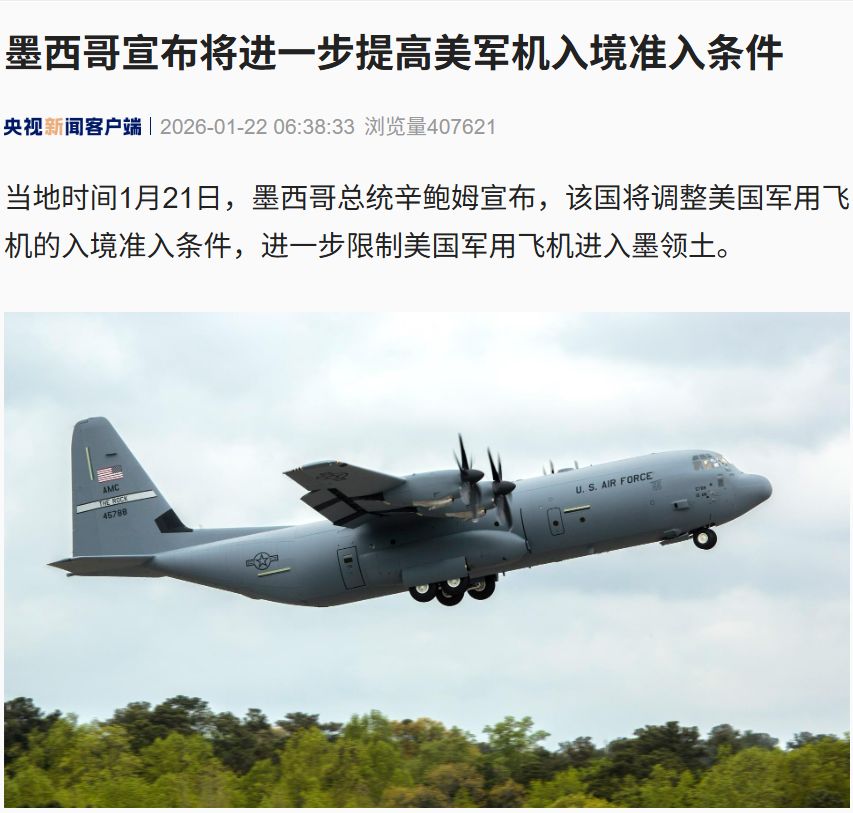 當(dāng)?shù)貢r(shí)間1月21日,墨西哥總統(tǒng)辛鮑姆宣布,該國(guó)將調(diào)整美國(guó)軍用飛機(jī)入境條件,進(jìn)一步限制其進(jìn)入墨領(lǐng)土。此前美軍機(jī)降落墨西哥曾引發(fā)爭(zhēng)議,辛鮑姆稱(chēng)以后參與國(guó)外培訓(xùn)的本國(guó)人員將由墨飛機(jī)運(yùn)送。此外,墨西哥參議院曾暫停授權(quán)美軍入境訓(xùn)練的投票,辛鮑姆強(qiáng)調(diào)墨不會(huì)屈從他國(guó),反對(duì)美任何形式干預(yù)。
