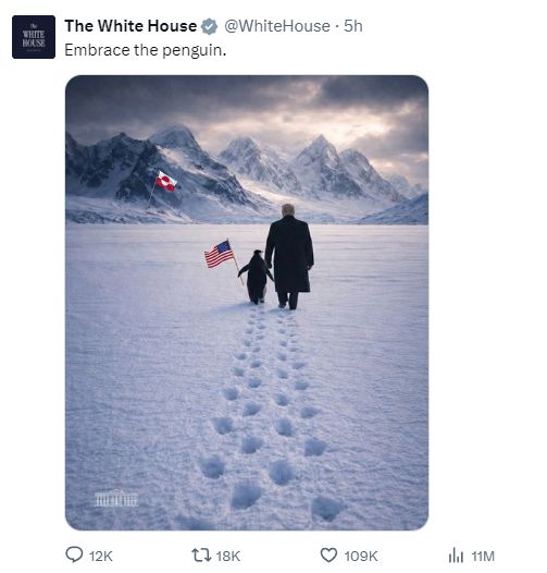 據(jù)央視新聞,當(dāng)?shù)貢r(shí)間1月23日,美國白宮在社交媒體發(fā)布了一張AI圖片。圖片中美國總統(tǒng)特朗普和手持美國國旗的企鵝行走在冰天雪地中,他們的前方插著丹麥自治領(lǐng)地格陵蘭島旗,并配文“擁抱企鵝”。