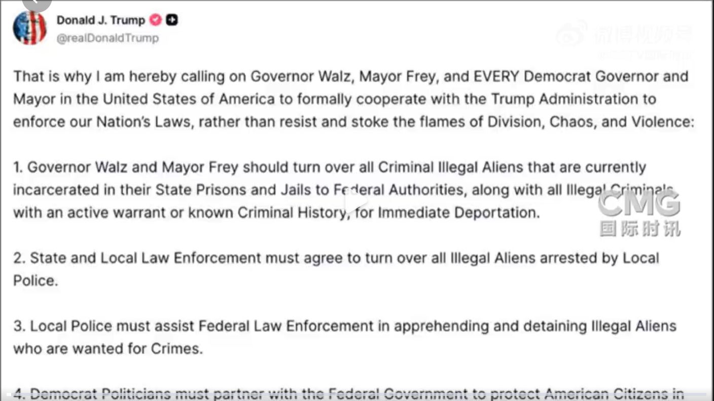 據(jù)央視新聞,當(dāng)?shù)貢r間1月25日下午,美國總統(tǒng)特朗普在社交媒體發(fā)帖,呼吁“全美每一位民主黨州長和市長,正式與聯(lián)邦政府合作執(zhí)法,而非抗拒執(zhí)法、煽動分裂、混亂與暴力”。