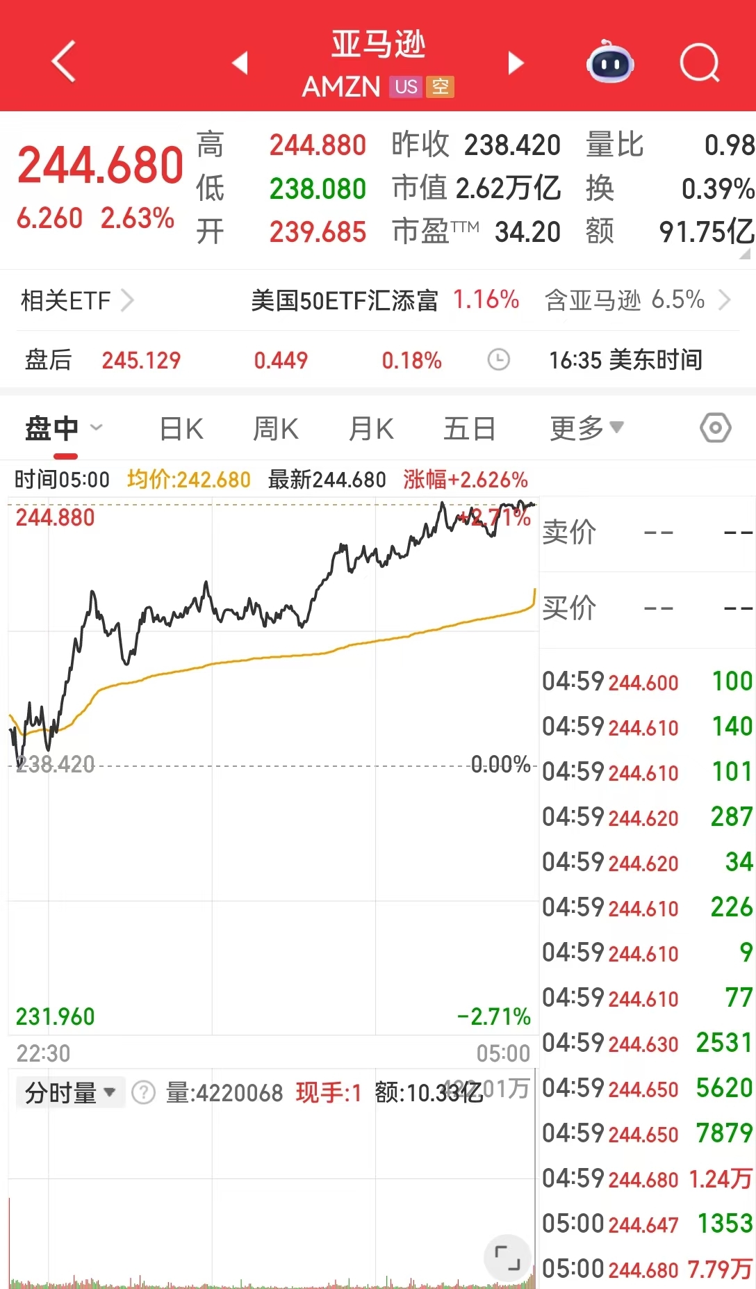 亞馬遜漲2.63%,市值一夜增加669億美元(約合人民幣4653億元)。