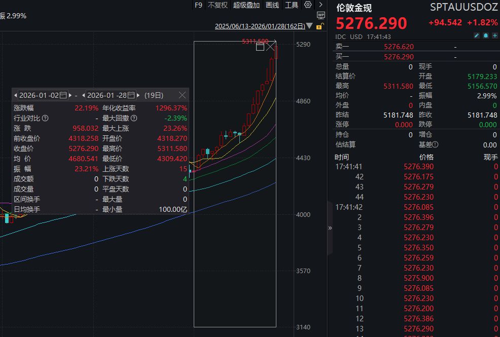 據(jù)Wind金融終端,北京時間1月28日16:30左右,美元計價的現(xiàn)貨黃金一度觸及5311.58美元/盎司,日內(nèi)漲幅一度達到2.51%,續(xù)創(chuàng)歷史新高。2026年開年以來,現(xiàn)貨黃金累計漲幅已超過22%。