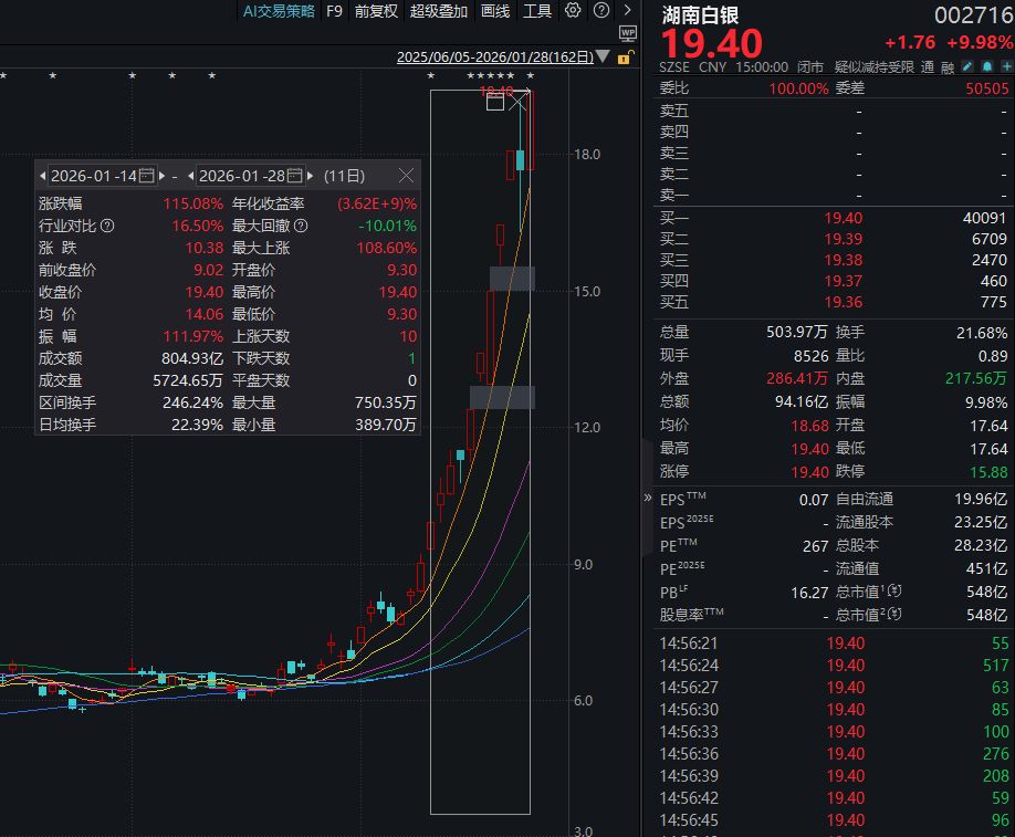 《每日經(jīng)濟新聞》記者(下稱“每經(jīng)記者”)注意到,湖南白銀是近期A股二級市場的焦點個股之一。Wind金融終端數(shù)據(jù)顯示,1月14日—28日收盤,湖南白銀在11個交易日內(nèi)收獲7個漲停板,期間累計漲幅達115.08%(前復權(quán),下同),期間累計成交額達804.93億元,區(qū)間換手率達246.24%。