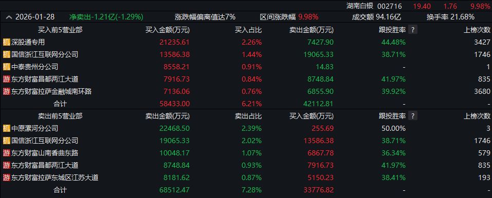 今日,湖南白銀午后再度漲停,截至收盤仍有7777.74萬元封單額,全天成交94.16億元,換手率21.68%。當日,滬深交易所公布的交易公開信息顯示,湖南白銀因漲幅偏離值達7%的證券登上龍虎榜。從龍虎榜公布的當日買賣數(shù)據(jù)來看,總買入額7.07億元,總賣出額8.28億元,總凈買-1.21億元。