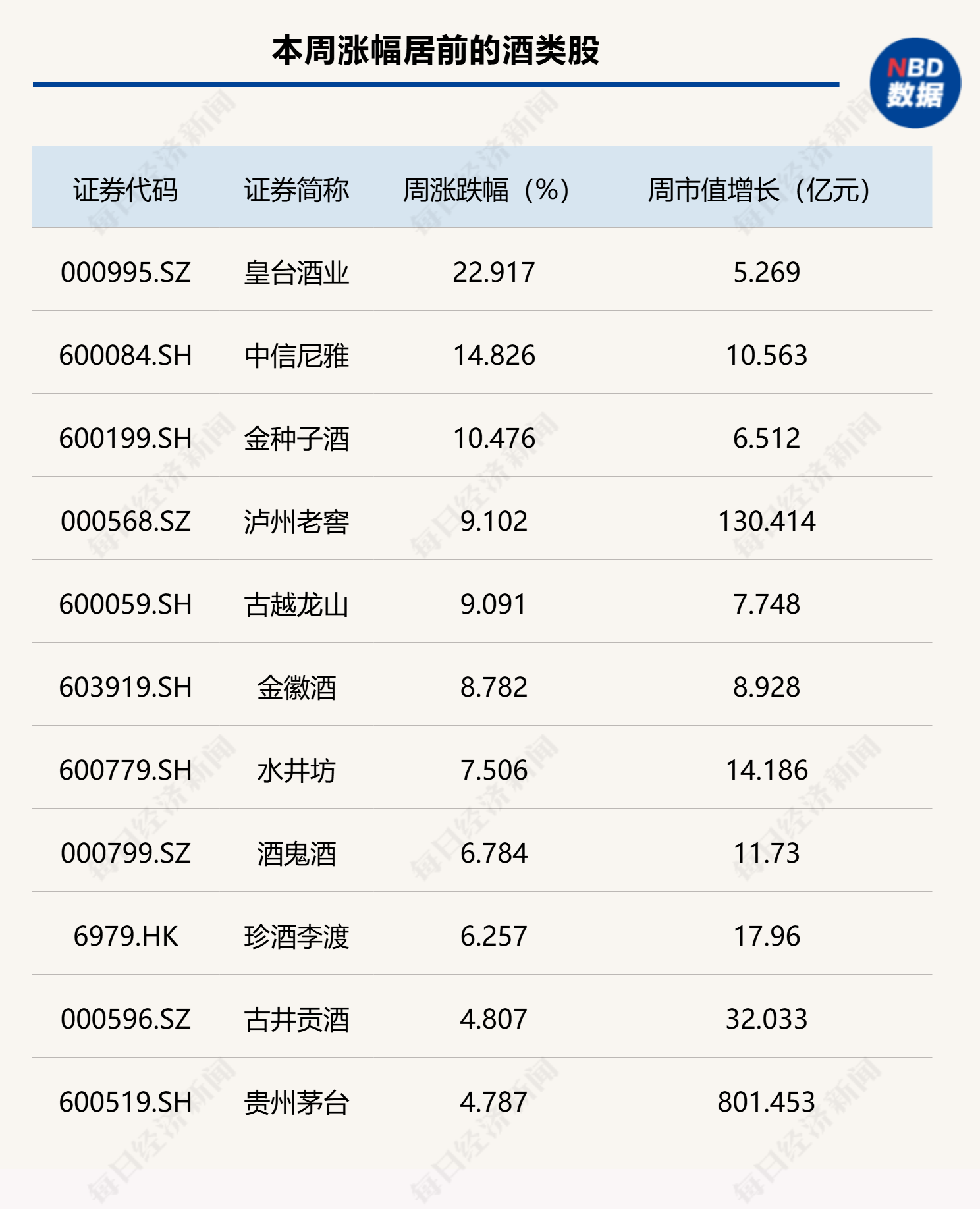 本周,茅臺(tái)批價(jià)全線回暖,飛天茅臺(tái)批價(jià)從年初低點(diǎn)上漲到1700元附近,再疊加地產(chǎn)政策放松以及市場風(fēng)格切換,白酒行業(yè)迎來一次暴力反彈。截至1月30日收盤,Wind白酒指數(shù)周漲4.17%,反彈力度較大。板塊內(nèi)皇臺(tái)酒業(yè)周漲幅高達(dá)22.92%,金種子酒周漲幅同樣達(dá)到10.48%,表現(xiàn)不俗;瀘州老窖、金徽酒、水井坊、酒鬼酒以及珍酒李渡周漲幅也均超過5%。在市值增長方面,貴州茅臺(tái)周市值增長801億元,斷檔領(lǐng)先。