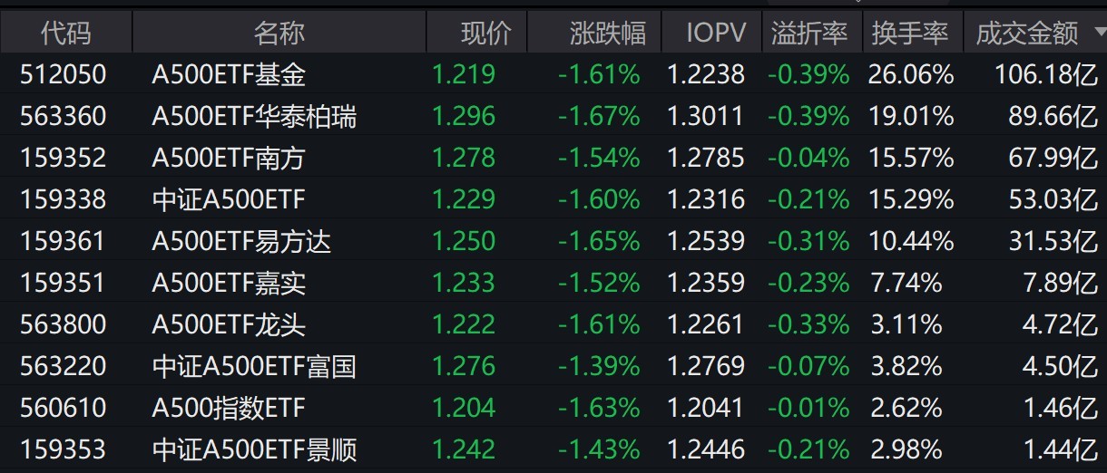截至上午收盤,場內(nèi)跟蹤中證A500指數(shù)的ETF跌超1%。其中,有10只中證A500相關(guān)ETF成交額超1億元,2只超89億元。A500ETF基金、A500ETF華泰柏瑞早盤成交額分別為106.18億元、89.66億元。