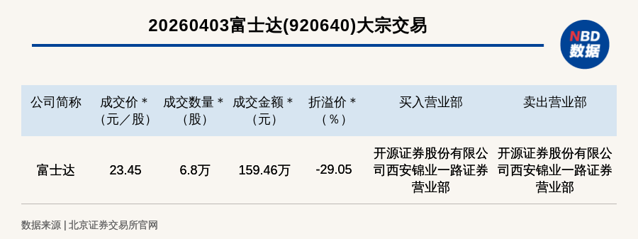 每經(jīng)訊,2026年4月3日,北交所上市公司富士達(dá)(920640,收盤價(jià):33.05元)發(fā)生一筆大宗交易,成交價(jià)23.45元/股,成交數(shù)量6.8萬股,成交金額159.46萬元,折價(jià)29.05%。買入營(yíng)業(yè)部是開源證券股份有限公司西安錦業(yè)一路證券營(yíng)業(yè)部,賣出營(yíng)業(yè)部是開源證券股份有限公司西安錦業(yè)一路證券營(yíng)業(yè)部。