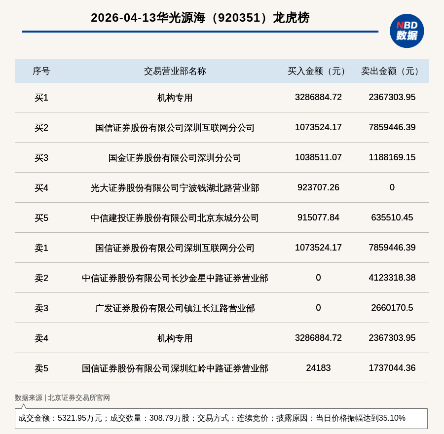 每經(jīng)訊,2026年4月13日,北交所上市公司華光源海(920351,收盤價:17.19元)登上龍虎榜,交易方式是連續(xù)競價,披露原因是當日價格振幅達到35.10%,成交數(shù)量308.79萬股,成交金額5321.95萬元。買一席位為機構(gòu)專用,買入328.69萬元;賣一席位為國信證券股份有限公司深圳互聯(lián)網(wǎng)分公司,賣出785.94萬元。