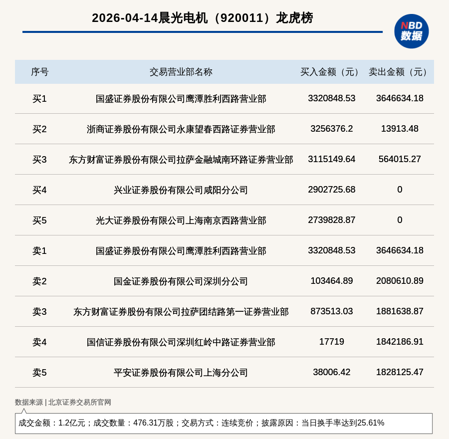 每經(jīng)訊,2026年4月14日,北交所上市公司晨光電機(jī)(920011,收盤(pán)價(jià):25.41元)登上龍虎榜,交易方式是連續(xù)競(jìng)價(jià),披露原因是當(dāng)日換手率達(dá)到25.61%,成交數(shù)量476.31萬(wàn)股,成交金額1.2億元。買一席位為國(guó)盛證券股份有限公司鷹潭勝利西路營(yíng)業(yè)部,買入332.08萬(wàn)元;賣一席位為國(guó)盛證券股份有限公司鷹潭勝利西路營(yíng)業(yè)部,賣出364.66萬(wàn)元。