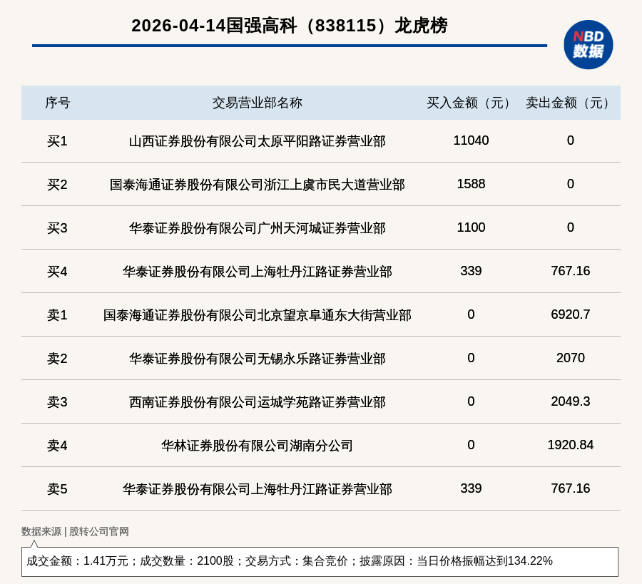 每經(jīng)訊,2026年4月14日,新三板創(chuàng)新層公司國強(qiáng)高科(838115,收盤價(jià):6.9元)登上龍虎榜,交易方式是集合競價(jià),披露原因是當(dāng)日價(jià)格振幅達(dá)到134.22%,成交數(shù)量2100股,成交金額1.41萬元。買一席位為山西證券股份有限公司太原平陽路證券營業(yè)部,買入1.1萬元;賣一席位為國泰海通證券股份有限公司北京望京阜通東大街營業(yè)部,賣出6920.7元。