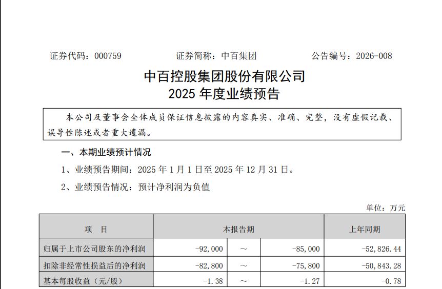 《每日經(jīng)濟(jì)新聞》記者注意到,中百集團(tuán)2025年實(shí)際虧損額超出了此前預(yù)期。根據(jù)公司1月底發(fā)布的業(yè)績預(yù)告,預(yù)計(jì)2025年歸屬于上市公司股東的凈利潤虧損8.5億元至9.2億元。而最終年報(bào)公告的9.57億元虧損額,突破了預(yù)告上限。