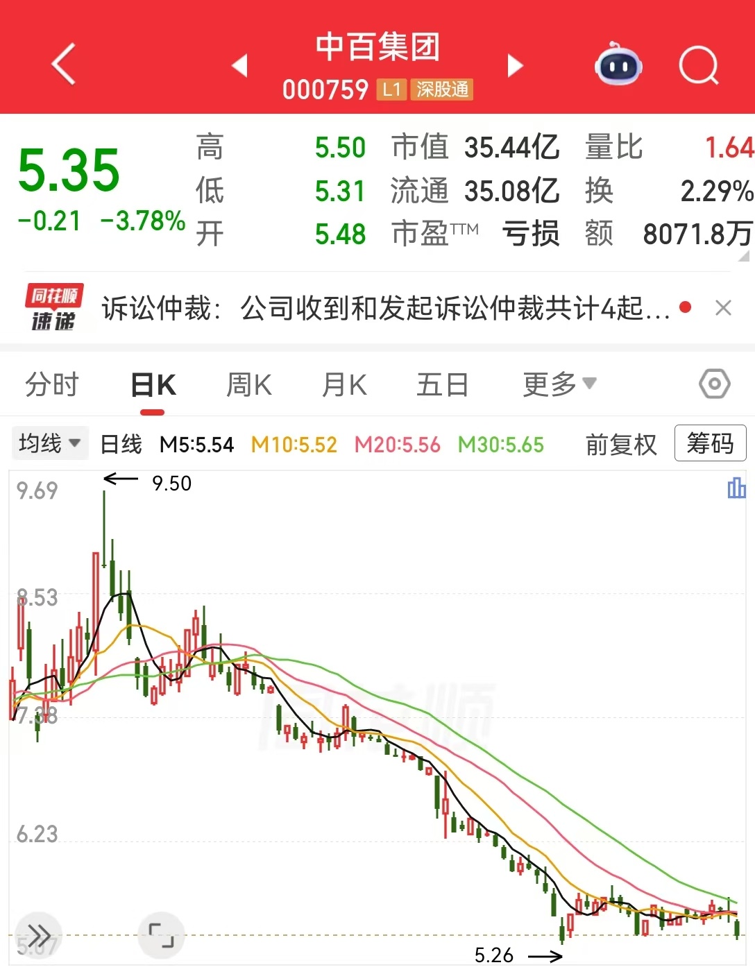2025年年度報(bào)告披露后,4月22日,中百集團(tuán)股價(jià)低開低走,截至午盤報(bào)5.35元,跌幅3.78%。