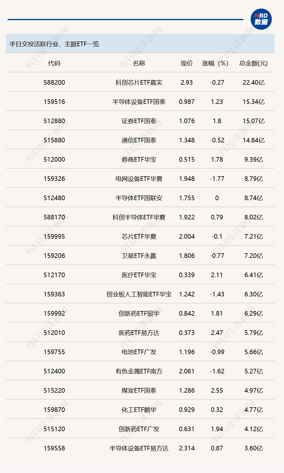 今日上午,科創(chuàng)芯片ETF嘉實(shí)(588200)交投保持活躍,成交金額為22.4億元。另外,半導(dǎo)體設(shè)備ETF國(guó)泰(159516)和證券ETF國(guó)泰(512880)半日成交金額也超過(guò)15億元;跨境ETF方面,中韓半導(dǎo)體ETF華泰柏瑞(513310)半日成交金額高達(dá)88.05億元,再度放量大漲。