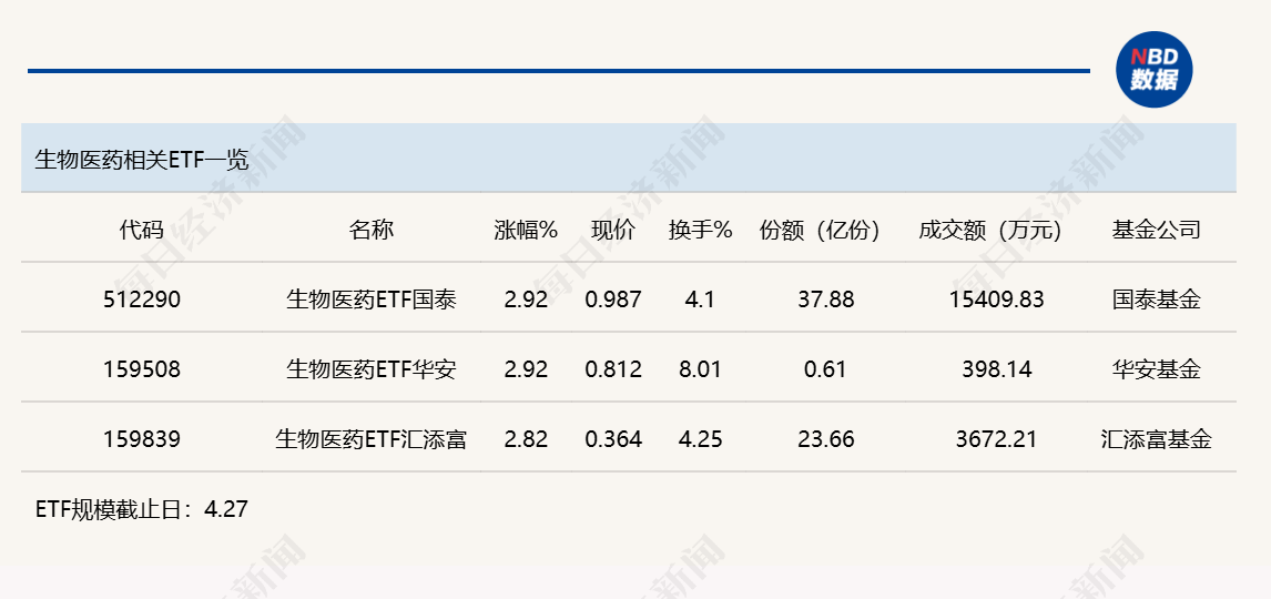 今日上午,科創(chuàng)芯片、半導(dǎo)體設(shè)備等多只ETF交投活躍,中韓半導(dǎo)體ETF華泰柏瑞半日成交88.05億元。藥明康德一季報(bào)帶動(dòng)CRO板塊反彈,三只生物醫(yī)藥ETF半日漲近3%。2025年中國(guó)創(chuàng)新藥出海數(shù)據(jù)創(chuàng)新高,生物醫(yī)藥成新興支柱產(chǎn)業(yè)。生物醫(yī)藥ETF國(guó)泰上漲2.92%,追蹤中證生物醫(yī)藥指數(shù);生物醫(yī)藥ETF華安和生物醫(yī)藥ETF匯添富分別2.92%和2.82%,均追蹤國(guó)證生物醫(yī)藥指數(shù)。